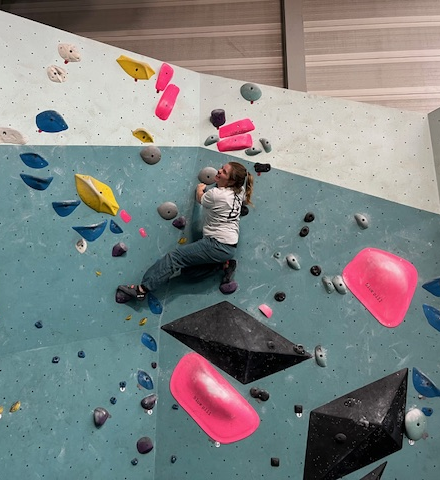 Voordelen klimmers: grote afwisseling van routes en grepen, zo klom ik bij Boulderhal BAZ opeens een route met grepen die ik normaal nog niet tegen zou komen.